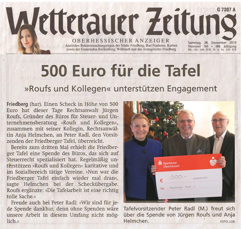 Auch wenn wir bundesweit Mandanten betreuen ist die Wetterau unsere Heimat. Die Region und ihre Menschen sind uns wichtig. Deshalb engagieren wir uns gerne mit Herz und Leidenschaft für soziale, kulturelle und sportliche Projekte